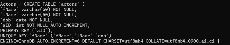 This database holds a small amount of data gathered from IMDB and RottenTomatoes regarding movies, their actors, their directors, and their reviews. The database holds 6 tables - Actors, Directors, Films, Actors_In_Films, Directors_Of_Films, and Reviews. Actors and Directors holds the first and last name of the actor or director, their date of birth, and an actor/director id. The primary key of Actors and Directors is their id and a unique is on the first name, last name, and date of birth. Films holds the title of the movie, the movie's release date, the movie's genre, the movie's budget, and a film id. The primary key is on the film id and there is a unique id on the movie's title, genre, and release date. Reviews contains a rating, a review, and a revew id. There is a primary key on the review id and no other keys. The Actors_In_Films and Directors_Of_Films tables are there simply because multiple actors can be in the same movie and multiple directors can direct multiple movies and this was the simplist way to represent that.