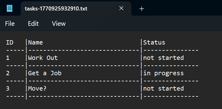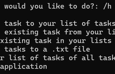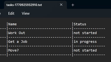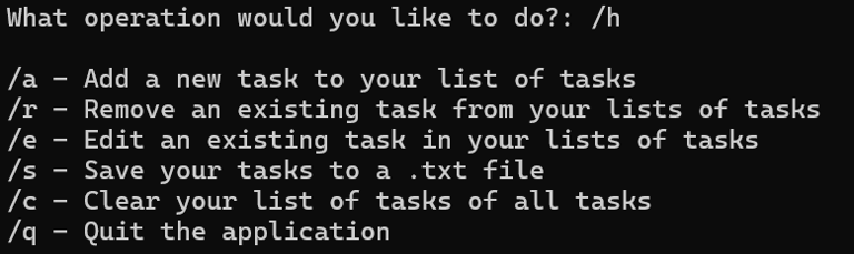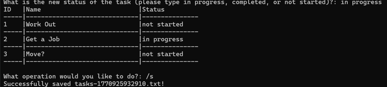 This CLI Task Manager allows the user to do a variety of different things. The user can add a task, edit a task, remove a task, or clear all tasks. They can also attempt to save their current task list to a .txt. This txt file will try to save to the same directory that the executable is in.